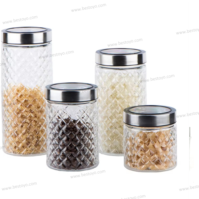 Contemporary 850ml-2200ml Glass Storage Jar with Embossed Pattern Acrylic Lid for Kitchen Food Storage Daily Use