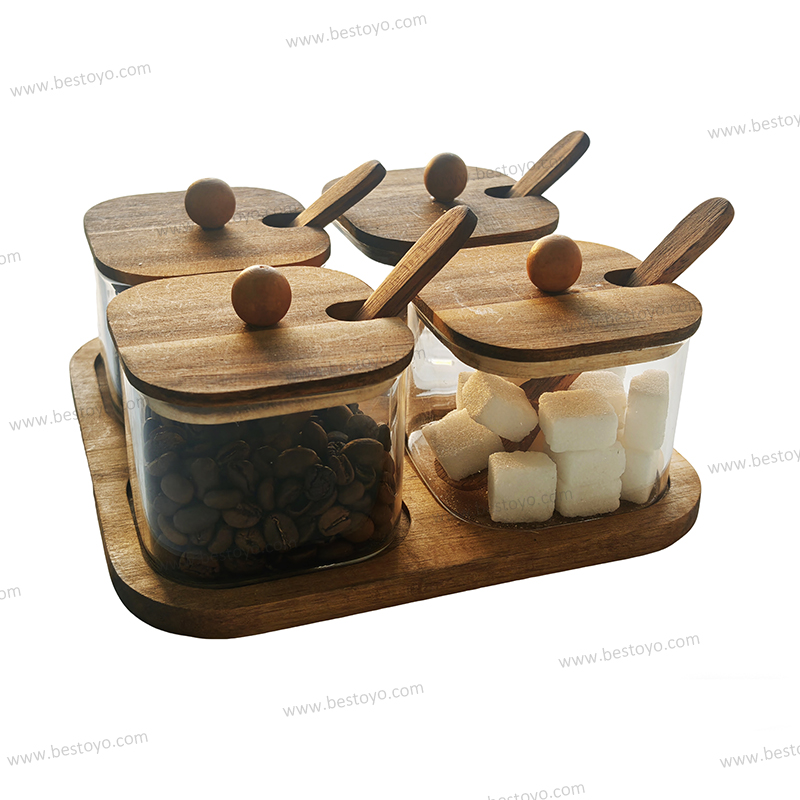 Household Acacia Wood Seasoning Jar Set (4-Piece) with Matching Spoons & Tray