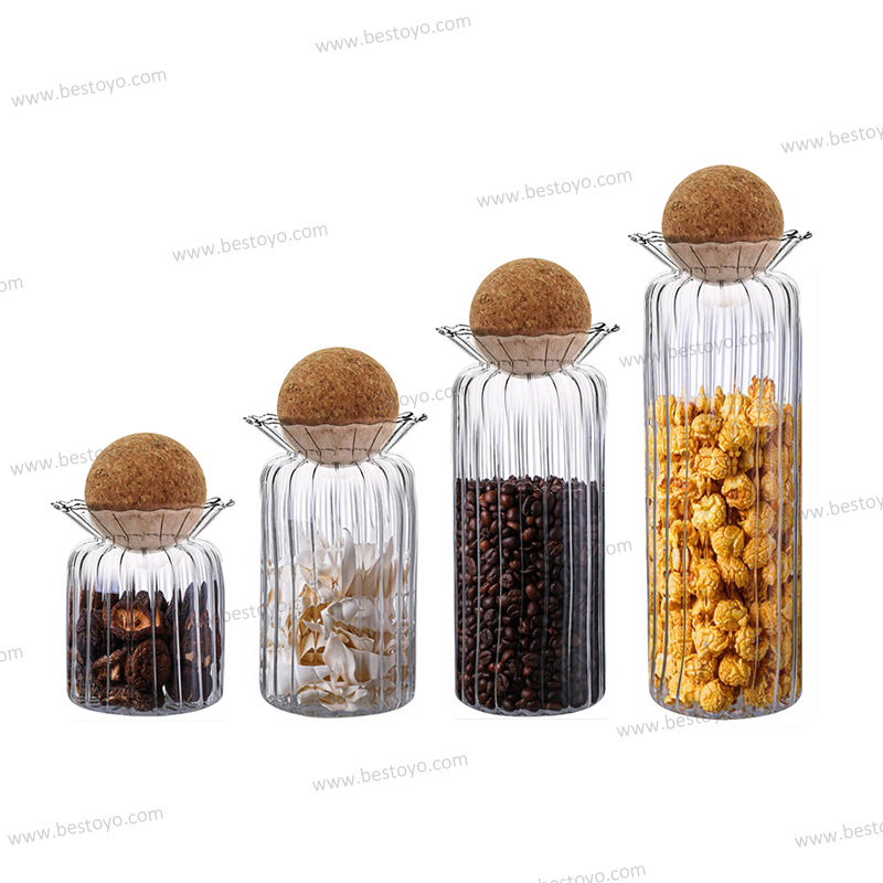 Ribbed Glass Storage Jars with Cork Ball Lids (4 Sizes Set) - Airtight Food Containers for Kitchen, Pantry, Coffee Beans, Snacks & Dry Goods